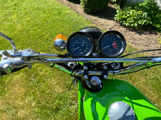 Kawasaki H2 Mach 4 Umbau mit TÜV Abnahme mit mit neu aufgebauten Motor Fast by Gast Zylinder und Köpfen, Wiseco Schmiedekolben . Die Kurbelwelle bekam neue Pleuel und Labyrinth Abdichtungen. Das Getriebe bekam neue Schaltgabeln , Lager und wurde neu ausdistanziert. Die Kickstarterwelle wurde verstärkt und eine Overshift Klinge montiert. Kröber Zündanlage, 34...