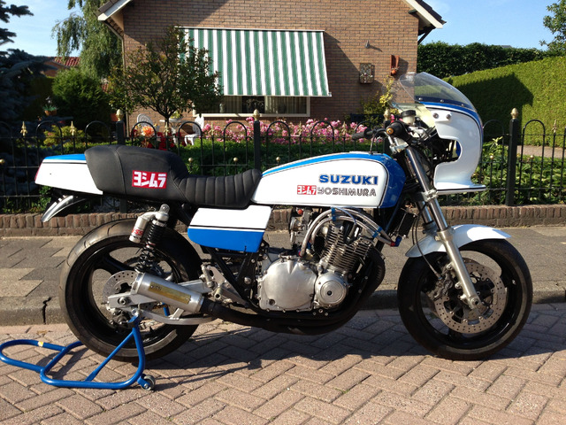 eine Suzuki GSX 1100E Umbau Caferacer USD , CBR Fahrwerk , TÜV 11.26 , 32000 km , nach Motortununig ca 3000 km gefahren , alles eingetragen . ( nur das Motortuning nicht ) Wiseco Kolben Nockenwellen , 145 Ps laut Vorbesitzer , Ducati Auspuff untern Heck , K+N Filter , Auspuff-Krümmer um den Motor verlegt , zurück verlegte Fußrasten , 2 x Tacho , ist zur Zeit angemeldet , nur Lackierung von Tank hat Lack - Probleme , der Tacho muß noch wieder eingestellt werden , ich gebe noch einen neuen runden Digitaltacho mit ich habe das Motorrad für mich selber gebaut --nun Knieprobleme , Herstellungskosten ca 7500 € , Preis 3700 € ,