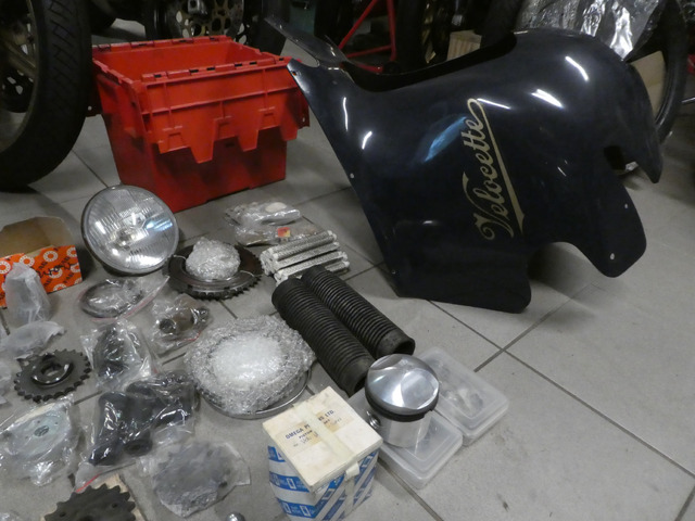 Diverse Wälzlager, Bronzebuchsen, Kupplungsbeläge, Ventile und Führungen, Omega-Kolben mit Ringen, Getriebezahnräder, Tachoantrieb, Kettenblätter, Dichtungen, Schrauben, verschiedenste Kleinteile, Scheinwerfereinsatz, Verkleidungsscheibe, Scheinwerferkuppel, etc.