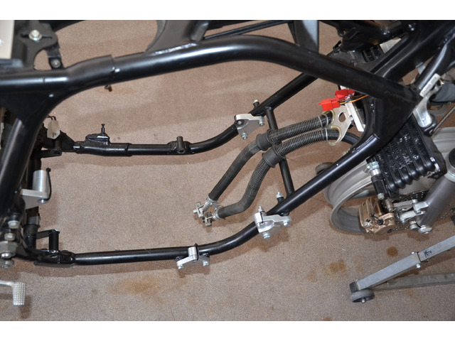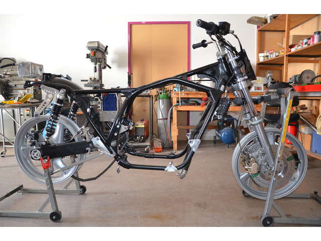 Lenkkopfwinkel auf 65° geändert, Unterzug verschweisst, Querrohre vor und hinter Motor zur Versteifung eingeschweisst, 20mm Schwingenachse, Alu Schwinge Kawa Zephyr, Räder 18" GSXR1100 und noch ein Rädersatz zum rollen, Gabel aus Honda Big One, YSS Stoßdämpfer. Die Schwingenaufnahme ist so eingeschweist dass die Achse parralel mit den Motorwellen verläuft.