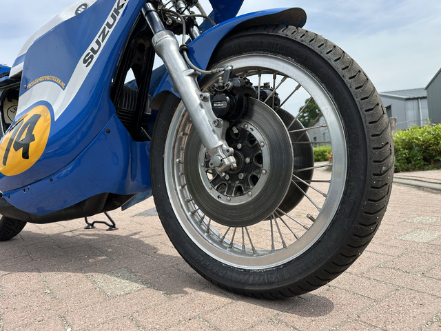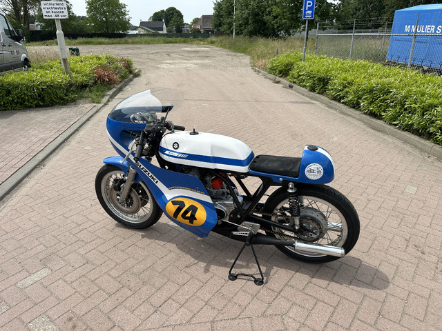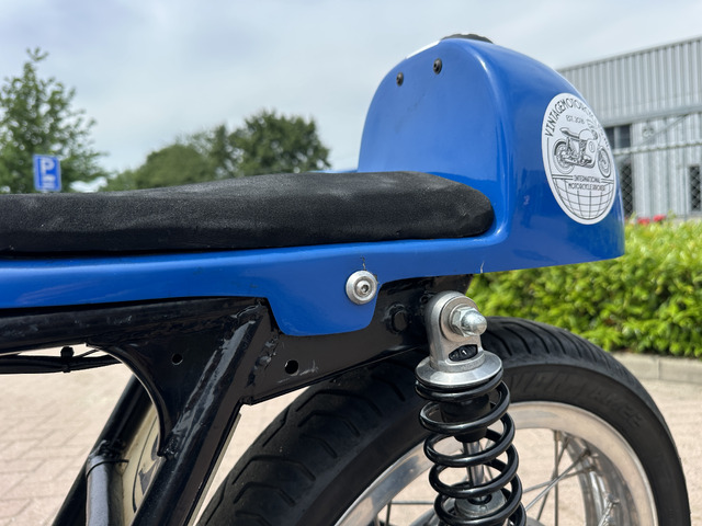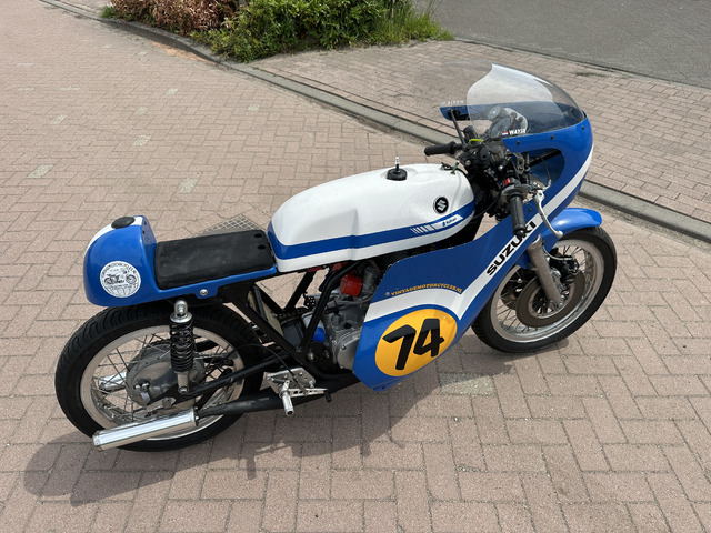Diese wunderschöne Suzuki T500 Racer ist eine Hommage an die goldene Ära des Zweitakt-Rennsports. Ursprünglich Ende der 1960er Jahre vorgestellt, war die T500 Suzukis Antwort auf die britischen Twins – ausgestattet mit einem robusten 492cc Parallel-Twin-Motor, rund 44 PS bei 7.000 U/min und einer Höchstgeschwindigkeit von ca. 185 km/h. Dieses Exemplar wurde zu einem echten Racer umgebaut und trägt ein auffälliges Blau-Weiß-Rennkleid, das seinen sportlichen Charakter unterstreicht.
