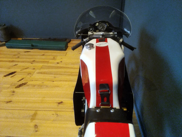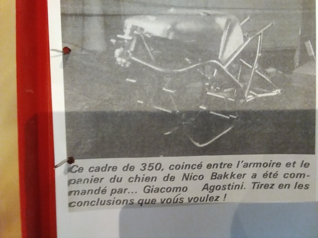Moto de course YAMAHA TZ350 CADRE Nico Bakker , moto que j'ai achetée à Johan t'en Napel (PAYS BAS) .Qui suite à un problème de santé n'a pas pu finir la moto . Le cadre N.Bakker avait été commandé par G.Agostini et est resté pendant des années à côté du panier du chien de N.Bakker . J'ai conduit la moto chez ERIC GENIN (ancien pilote) et très bon mécanicien pour achever le montage de la moto . Depuis la moto est dans mon salon , pour renseignements : Philippe 0032 475 810191