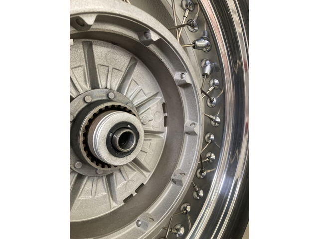 Das Rad war verbaut in der leichten 2-Armschwinge der späten /5 und /6 ohne Ruckdämpfer, die lange Druckhülse auf der rechten Seite ist montiert.