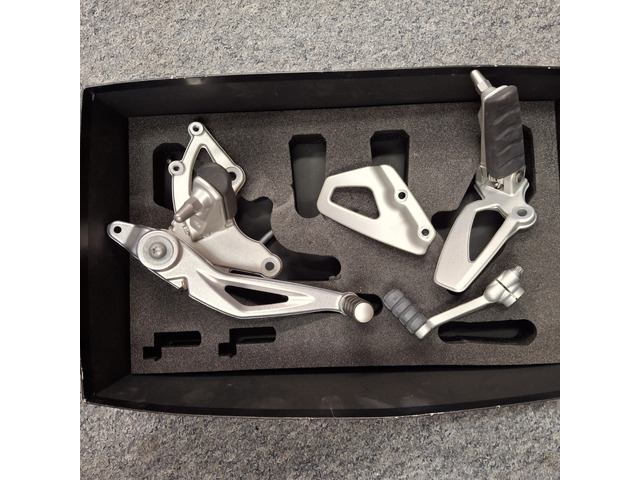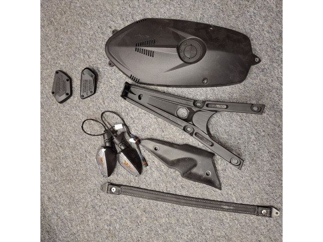 Gabel, Stoßdämpfer, Auspuffdämpfer, Fußrasten-Anlage, Motordeckel, Brems. u. Kupplungsbehälter-Deckel, Blinker, Haltegurt.