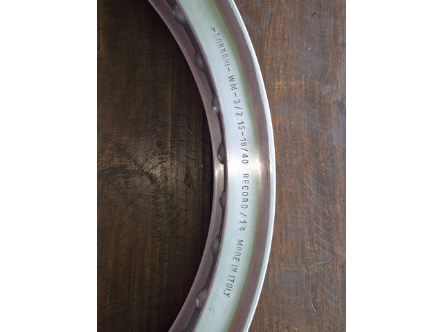 -WM-3/2,15-18/40 Record/14. Die Felge hat Gebrauchsspuren, ist aber garantiert rissfrei. Verbaut war sie an einer Ducati Königswelle.