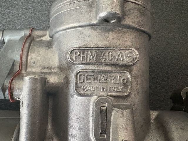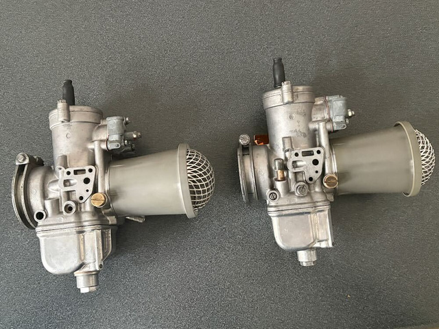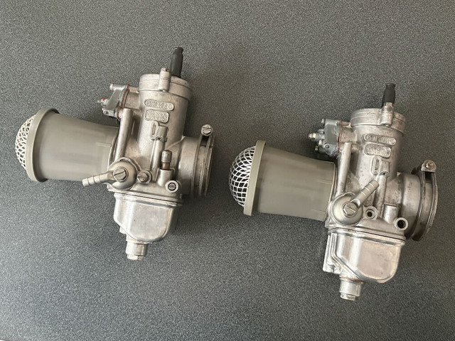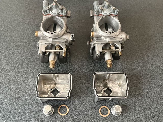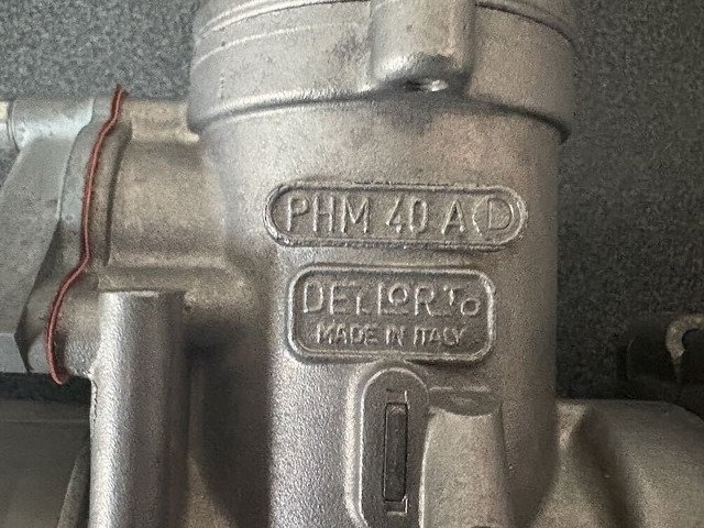 DELLORTO PHM40 AS + AD Vergaser wie sie an der DUCATI 750 SS Desmo und 900 SS Desmo und an der 900 MHR 1. Serie montiert waren, aber auch für andere sportliche Königswellen-DUCATIs als Tuning-Vergaser. Die zwei grauen Ansaugtrichter sind in Top-Zustand. Komplett bestückt mit Schiebern 60/1, Nadeldüsen 265 AB, Nadeln K4, Leerlaufdüsen 65, Hauptdüsen 155, schwarze Schwimmer 10g. Die Vergaser sind Ultraschall gereinigt und mit neuen Dichtsätzen zusammengebaut. Der Preis ist inklusive versichertem Versand in der EU.