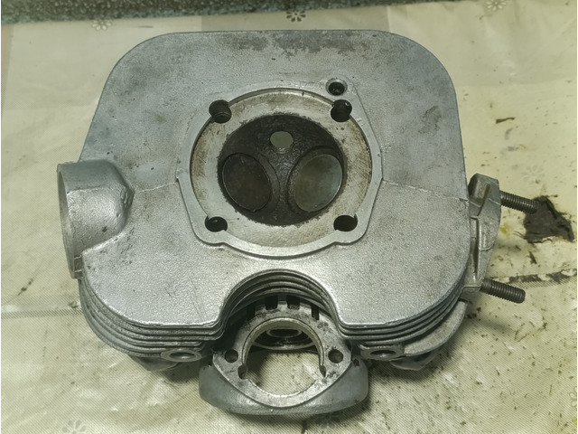 Ducati 175 cylinder head. In good condition, no visible cracks. Threads in good condition at original size, including exhaust thread, spark plug and oil passage. Tested with original nut and screws. The bearing is old and needs to be replaced.