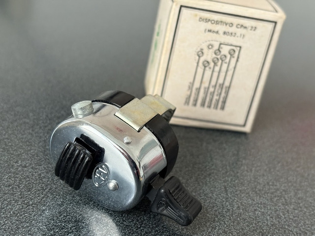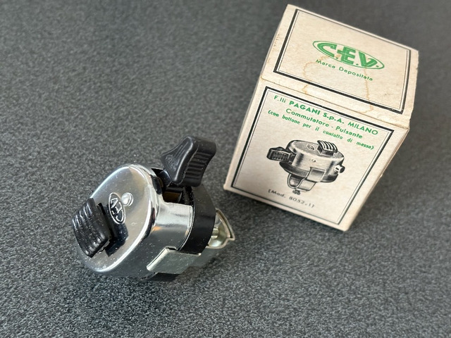 CEV Lenkerschalter (Startknopf-Hupe-Lichtschalter), wurde original an der LAVERDA 750 SFC 1974 und an der 750 SFC Electronica 1975–76 verbaut, in Originalverpackung, perfekter Zustand, nie montiert. Preis inkl. Versand in der EU.