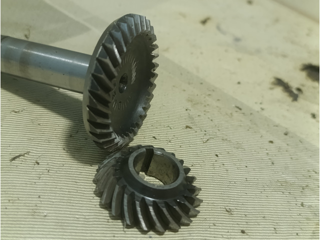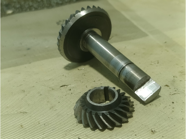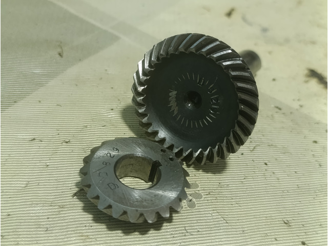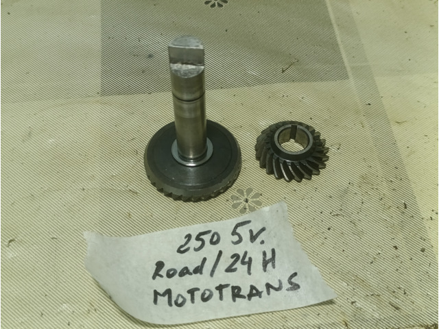 Lower bevel gear set. Z=21-30. Ducati 5-speed Mototrans narrow case 24 Horas, Road. These are an original factory set and have been used together. All teeth and the crescent-shaped anchor are in good condition.