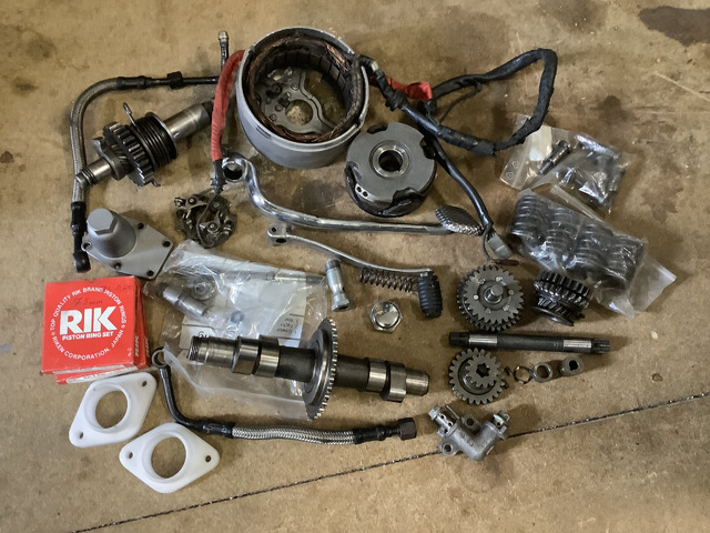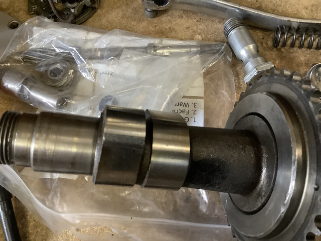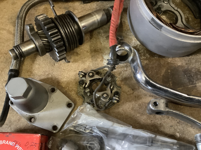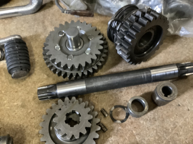 Complete starter assembly: shaft, pinion, springs, washers, and bushings. Teeth and splines in good condition, except for minor marks on some teeth (see photos). For Ducati Mototrans narrow crankcase 4-speed, with a 17mm secondary shaft. Fits Ducati 160, 175, 200, 250, TS, Sport, Elite, and Deluxe. Contact us for more Ducati single-speed parts.