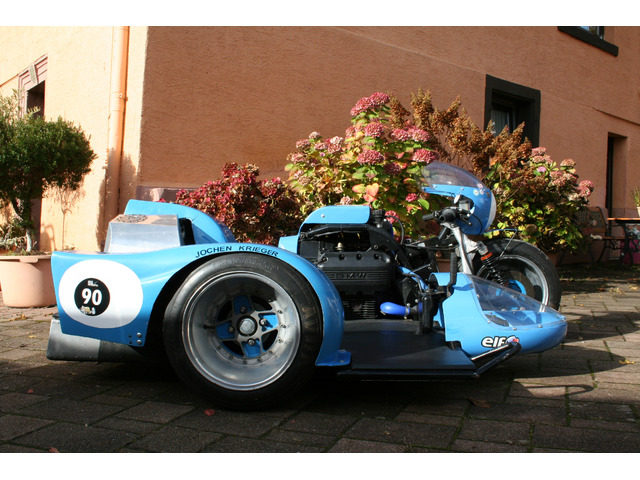 Verkaufe aus Altersgründen mein Klassik Renngespann. Das Gespann war eine ehemaliges Rolf Steinhausen Konstruktion aus Flugzeugrohr 0,8mm Hartgelötet ,bei einem Rennen in Frankreich brach die Gabel am Lenkkopf ab, danach wurde der Rahmen nach Original maßen mit Kalt gezogenem Präzisonsrohr ST52 nachgebaut mit einem BMW K75 Motor ikl. Kardanantrieb bestückt. Das Gespann hat eine sehr gute Spureigenschaft fährt sich sehr leicht und hat ein Super Sound. Keine Schraubereien und Einsellarbeiten vorm Start nur Anlasserknopf drücken und Fahrspaß haben,K75 Motoren gehen immer.