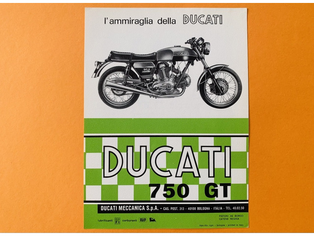 DUCATI 750 GT originaler Prospekt von 1972, Format 31,5x23,5 cm, 2 Seiten, vom amerikanischen Importeur Berliner, sehr guter Zustand.