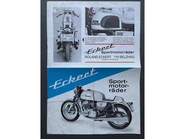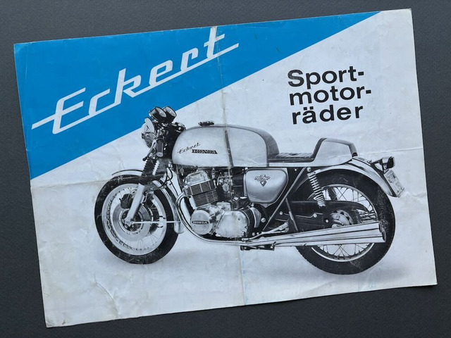 Sehr seltener Prospekt ECKERT SPORTMOTORRÄDER, HONDA CB750 Four, Format A4, 4 Seiten, Beschreibung von Stummellenkern, Fußrasten, Auspuffanlagen, Stahltanks vom deutschen Tuner Roland Eckert, leider in der Mitte geknickt, leicht beschädigt. Preis inkl. Versand in der EU.