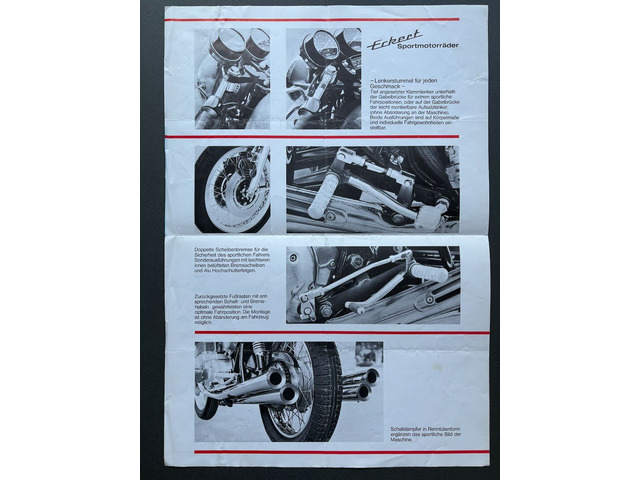 Sehr seltener Prospekt ECKERT SPORTMOTORRÄDER, HONDA CB750 Four, Format A4, 4 Seiten, Beschreibung von Stummellenkern, Fußrasten, Auspuffanlagen, Stahltanks vom deutschen Tuner Roland Eckert, in der Mitte geknickt, leicht beschädigt. Preis inkl. Versand in der EU.