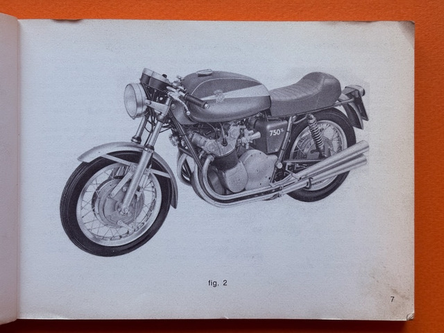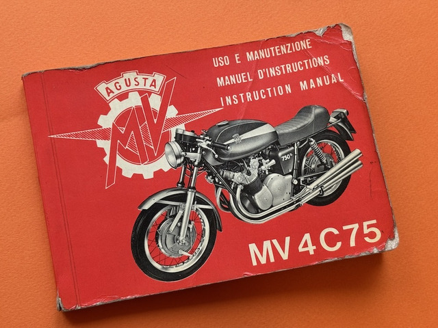 Originales Fahrerhandbuch für die erste Serie der MV4 C75 oder MV AGUSTA 750 Sport, 1. Edition April 1972, Format 15,5x11cm, 136 Seiten, 2 faltbare Schaltpläne, Text in Italienisch, Französisch und Englisch, in sehr schönem Zustand, der Umschlag ist nur leicht beschädigt, Innenteil fast ohne Gebrauchsspuren. Preis EUR 320,– inklusive Versand in der EU.