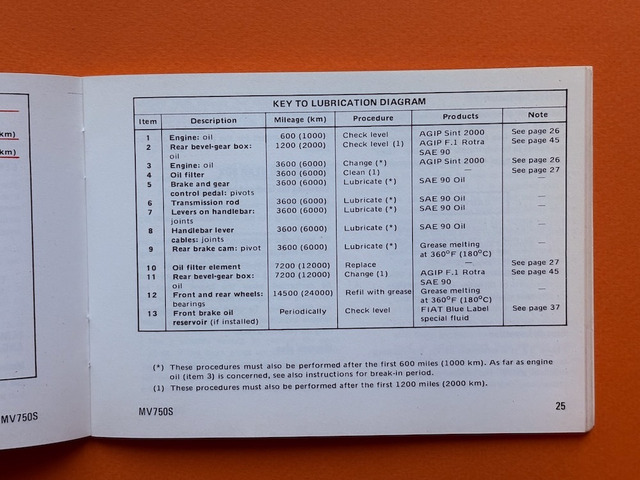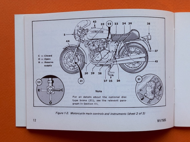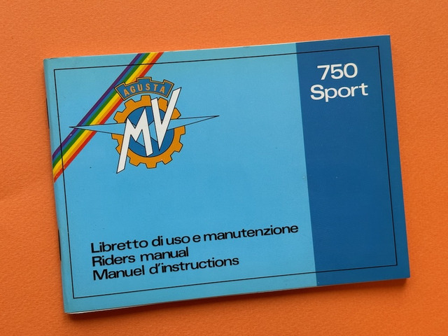 Originales Fahrerhandbuch für die MV AGUSTA 750 Sport von 1972 – 1974, Format 15,5x11cm, 68 Seiten, Bedienungsanleitung - Wartungshinweise - Fehlersuche - 2 faltbare Schaltpläne, Text in Englisch, in perfektem Zustand, ohne Benutzungsspuren. Preis EUR 225,– inklusive versichertem Versand in der EU.