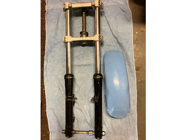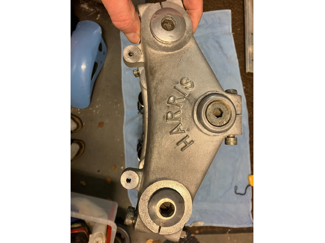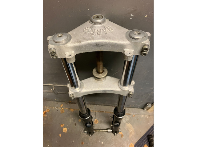 Harris Ceriani fork 38mm. Wheel axle 17mm. Steering stem 25mm. Width at wheel axle 140mm. Fork leg-cc axle 840mm. Uk steering head-cc wheel axle 620mm.