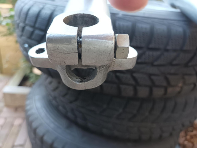Die Gabel stammt von einer Yamaha TZ,Durchmesser 35 mm mit Brembo Bremse. Ein Standrohr hat leichten Rostansatz. Das Teil lagert seit 10 Jahren bei mir.