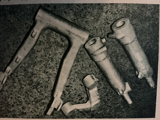 Die Gabel stammt von einer Yamaha TZ,Durchmesser 35 mm mit Brembo Bremse. Ein Standrohr hat leichten Rostansatz. Das Teil lagert seit 10 Jahren bei mir.